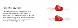 Active Noise Cancelling (ANC) continuously blocks unwanted external noise. Switch to Transparency mode when you need to hear the world around you. External-facing microphones allow the sounds of your surroundings back in for a natural listening experience.