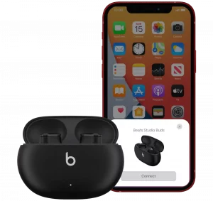 Beats Studio Buds with case next to an Android phone displaying the Beats app