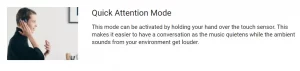 This mode can be activated by holding your hand over the touch sensor. This makes it easier to have a conversation as the music quietens while the ambient sounds from your environment get louder.